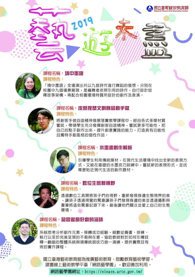 三、前開課程選讀,請登錄「網路藝學園」平臺(http://elearn.arte.gov.tw/)或「行動藝學園」APP(http://elearn.arte.gov.tw/base/10001/door/elearn_college/index.html),歡迎上網學習運用。