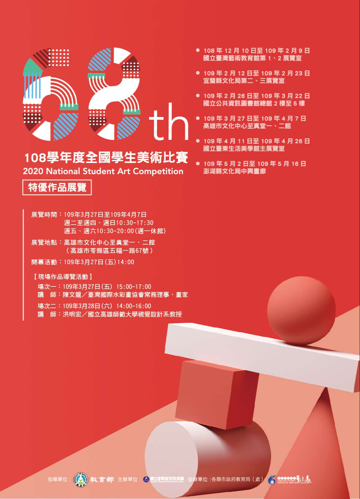 一、巡迴展於109年3月27日至4月7日假高雄文化中心至真堂一、二館展出,,並於109年3月27日(星期五)下午3時、109年3月28日(星期六)下午2時舉辦現場導覽活動,歡迎學校師生踴躍參觀。