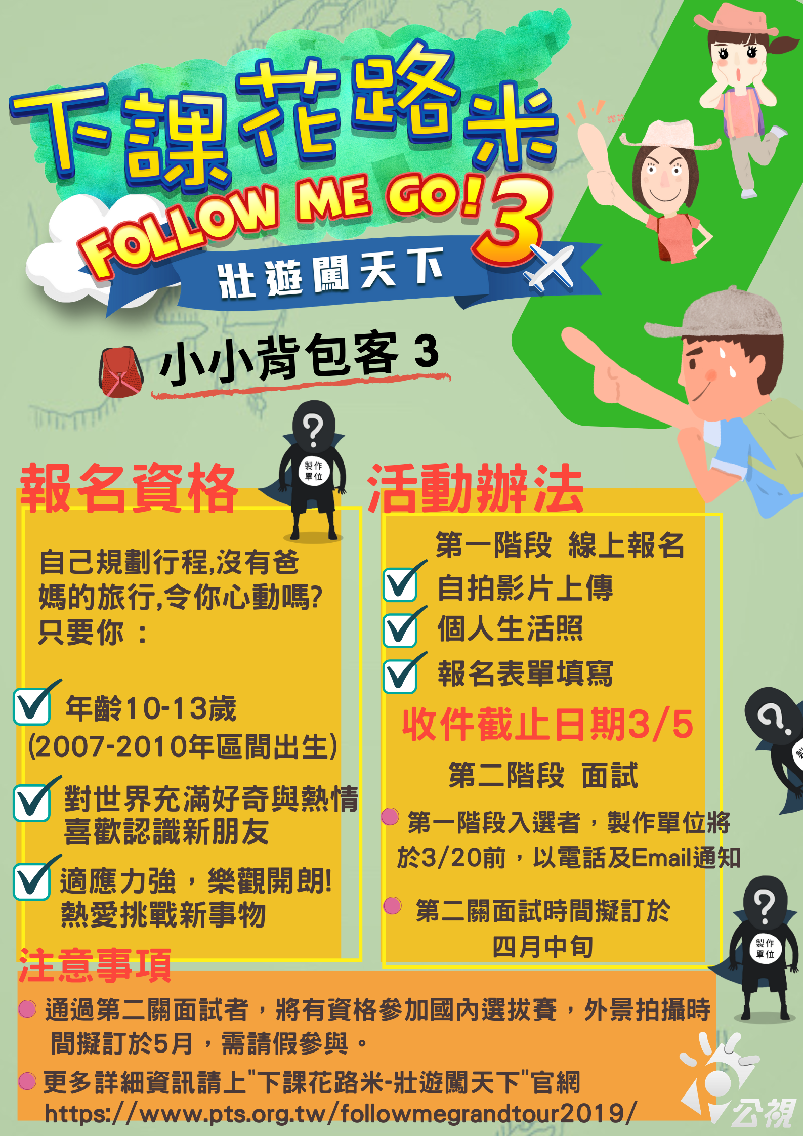三、檢附原函一份,詳細內容及辦法請上活動官網: https://www.pts.org.tw/followmegrandtour2019/cast2.html或臉書搜尋『下課花路米』粉絲團。