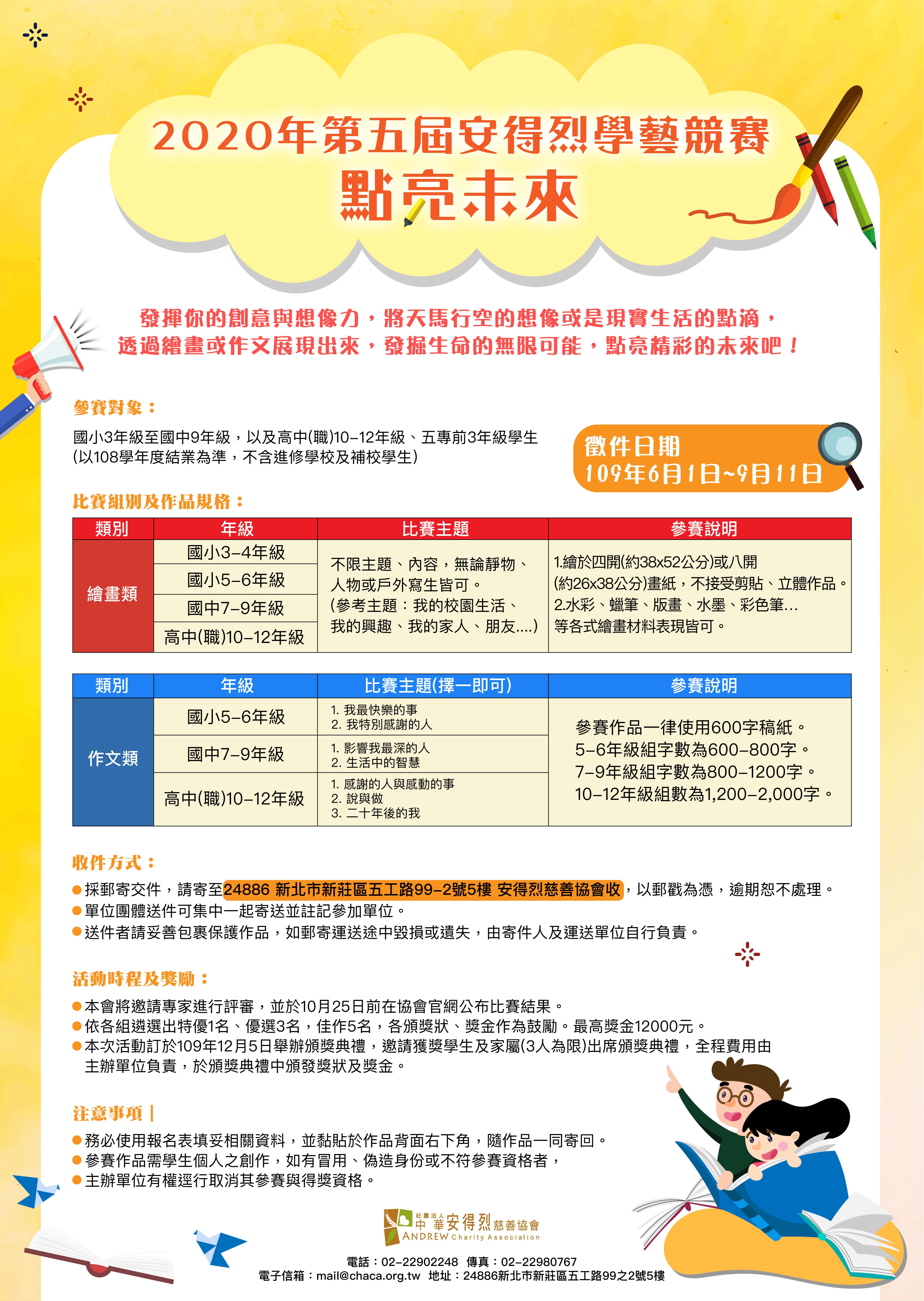社團法人中華安得烈慈善協會辦理「2020年第五屆學藝競賽」鼓勵清寒弱勢學生踴躍投稿。