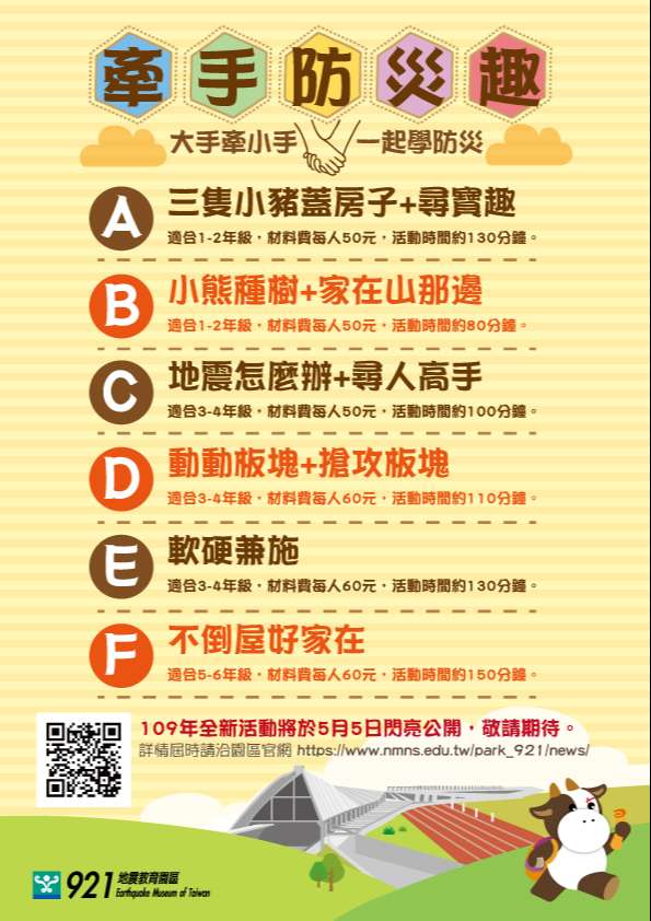 二、該園區規劃於暑假辦理「牽手防災趣」到校服務活動,透過套裝行程,帶領大家從多元主題來認識地震與防災,活動資訊如下:
