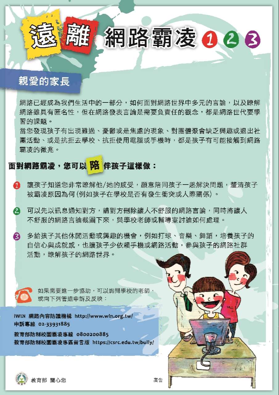 教育部「中小學網路素養與認知」及「全民資訊素養網」網站,能幫助家長了解孩子的網路世界,協助他們養成「安全、合理、合宜、合法」的態度與使用行為。