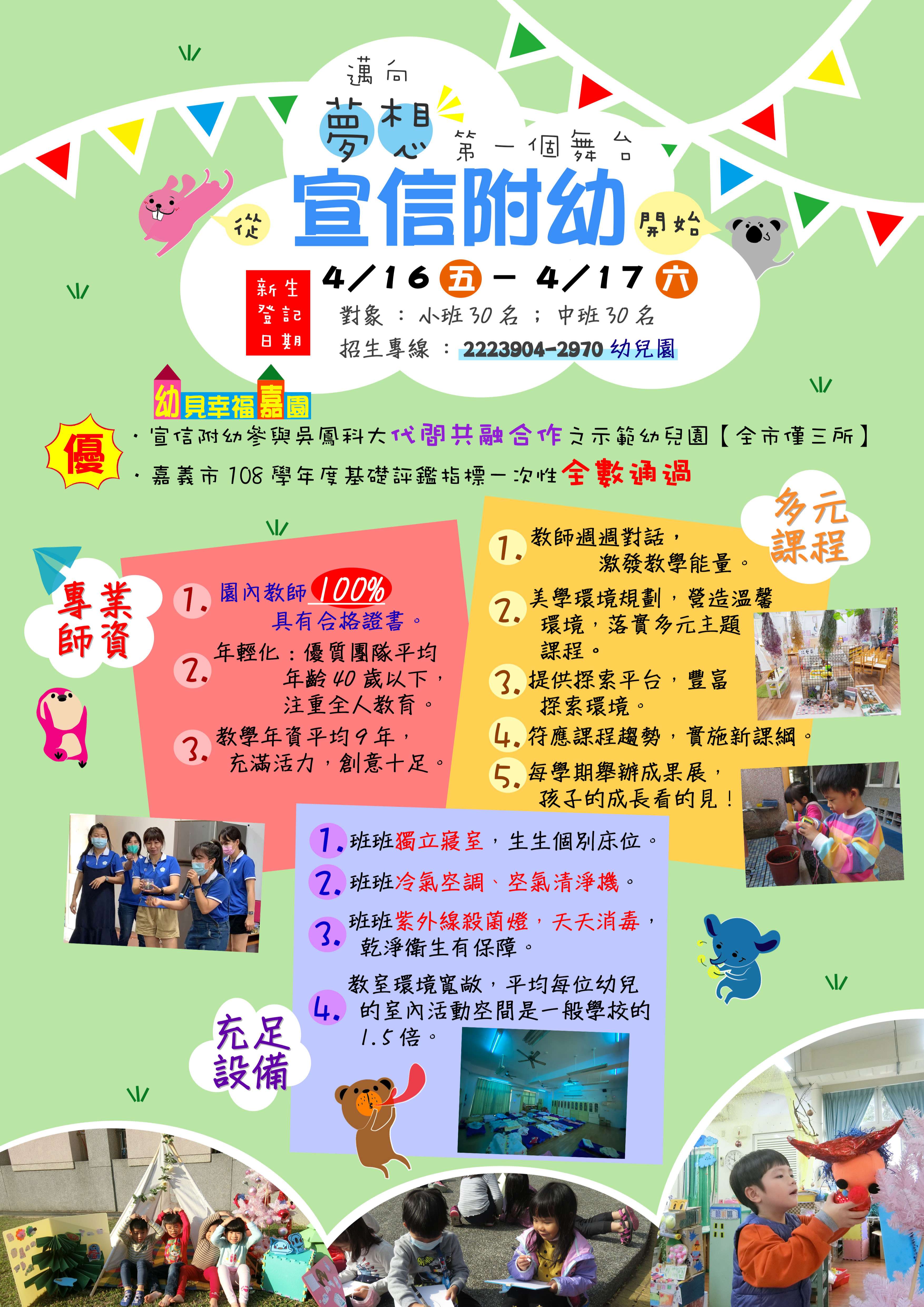 本校附設幼兒園辦理110學年度招生活動,歡迎加入宣信大家庭~~