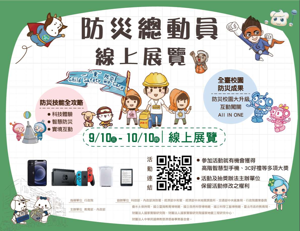 五、本案活動展覽期程為110年9月10日至10月10日,請上教育部防災教育資訊網(https://disaster.moe.edu.tw)互動體驗。