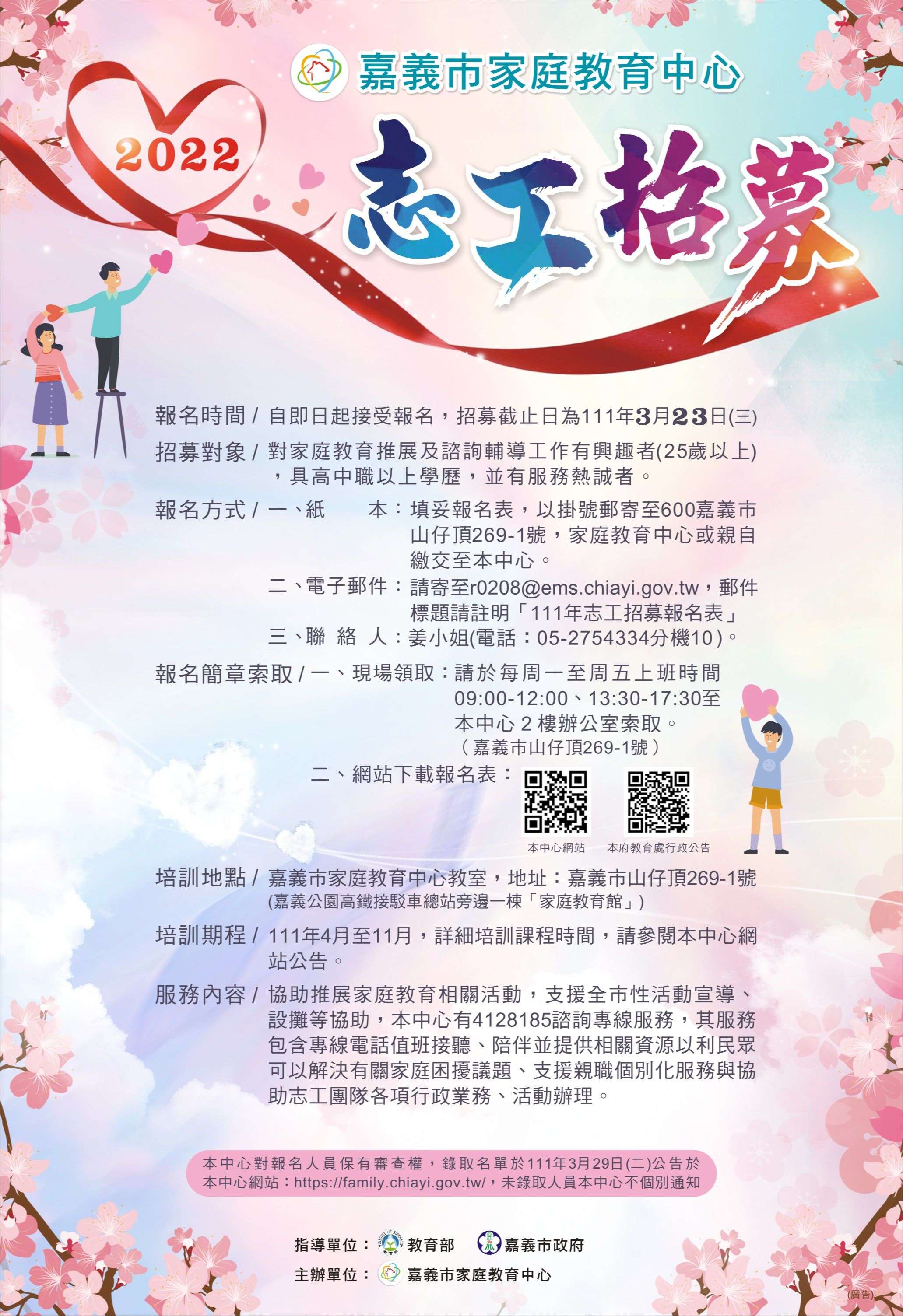 五、並於111年3月29日公告志工錄取名單(40名額為限)及後續培訓課程時間,於本中心網站:https://family.chiayi.gov.tw/最新消息下載。