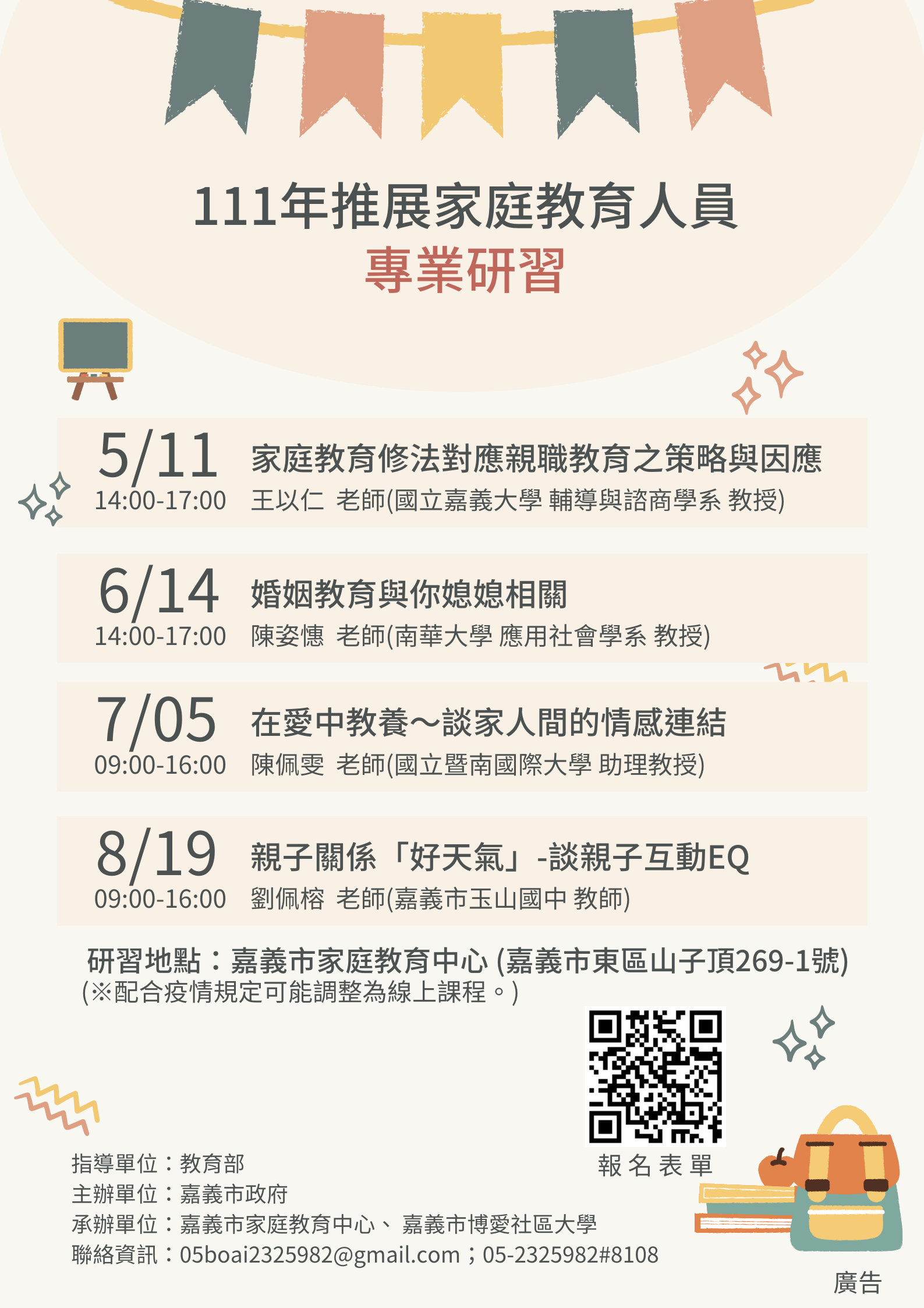 (一)5月11日下午2時至5時,主題內容:家庭教育修法對應親職教育之策略與因應。