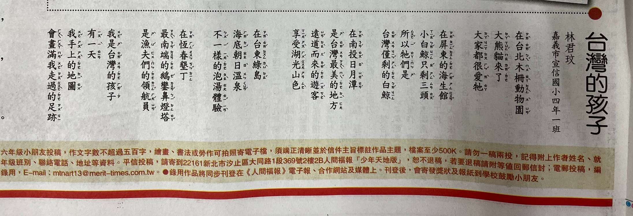 恭喜本校四年1班(110學年度班級)林君玟同學作品8/4刊登在人間福報,感謝林慧娟老師的指導!