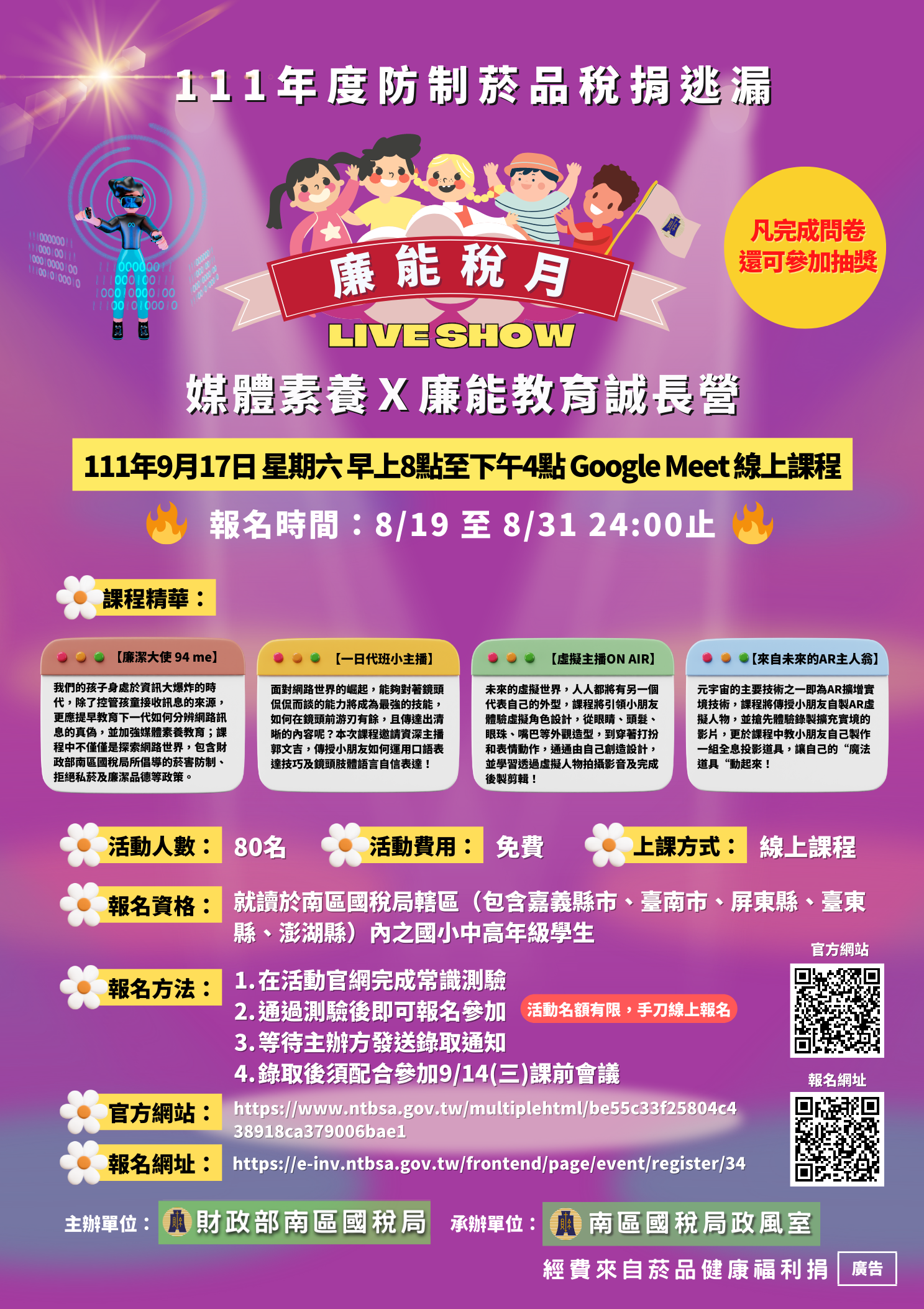 二、鑑於品格、誠信及廉政教育應從小扎根,該局運用菸品健康福利捐供私劣菸品查緝及防制稅捐逃漏經費,辦理「廉能稅月Live Show-媒體素養X廉能教育誠長營」活動,期藉由菸稅及廉潔品德教育暨新媒體課程體驗等多元課程內容,讓民眾及學子瞭解私劣菸品危害,建立防制菸品稅捐逃漏及勇於檢舉貪瀆不法等廉潔常識觀念,以落實宣導政府嚴正執法之決心。