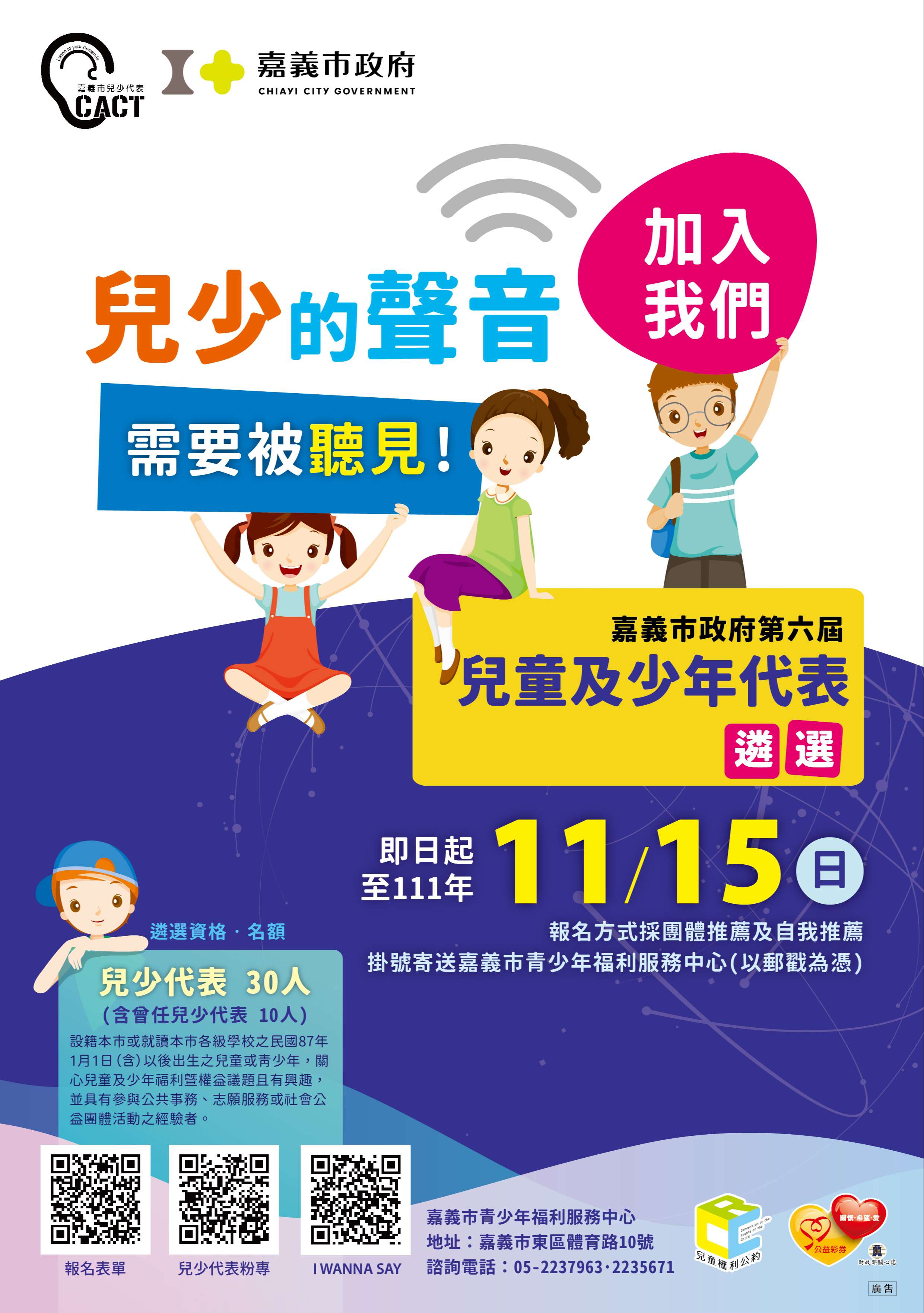 二、遴選資格:設籍或就讀本市各級學校,民國87年1月1日(含)以後出生之兒童或青少年,關心兒童及少年福利暨權益議題且有興趣,並具有參與公共事務、志願服務或社會公益團體活動之經驗者。