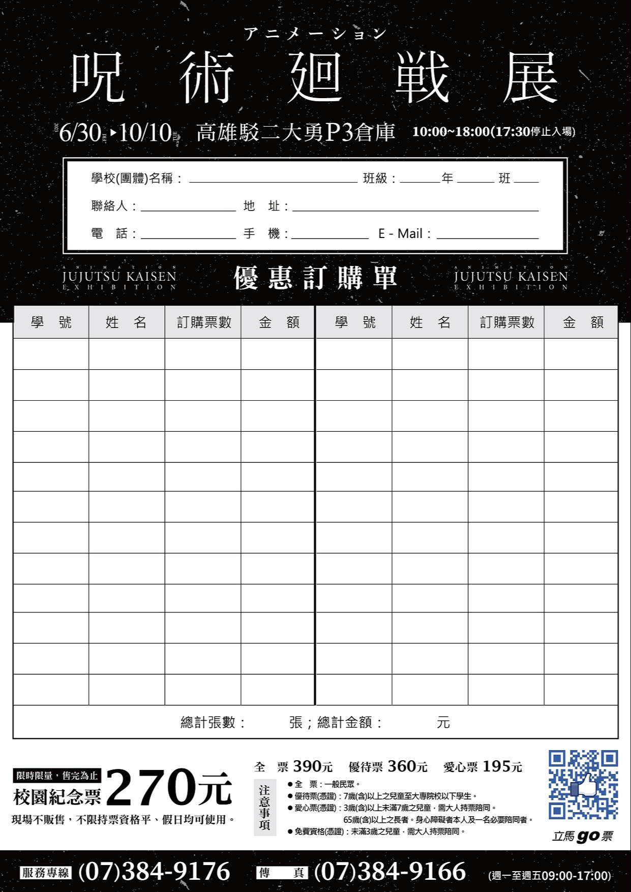 一、為充實國人文化藝術視野、推廣動畫教育、增進國際教育的深度與廣度,本公司特引進日本超人氣漫畫「咒術迴戰」展覽。「咒術迴戰」自2020年改編動畫後引爆全球熱潮,成為現象級動畫大作,於日本巡迴展內容分兩期展出,本次「咒術迴戰展」海外特展集結所有作品,一次完整呈現給台灣觀眾,期待透過包含數百幅原畫、分鏡圖、等身FRP、巨型動畫投影及名場還原等豐富展品,一窺圖像授權產業成功背後的密訣!