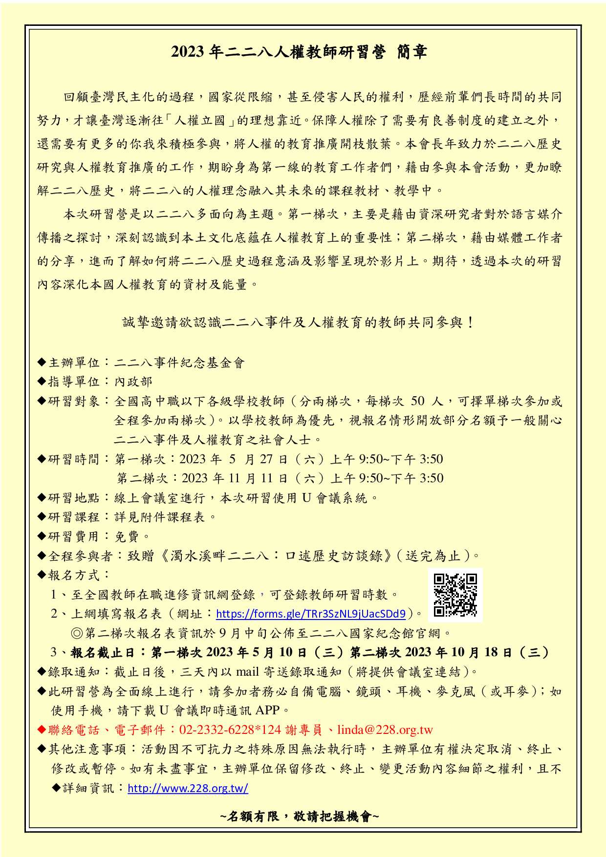 四、檢送「2023年二二八人權教師研習營」簡章及課程表供參。