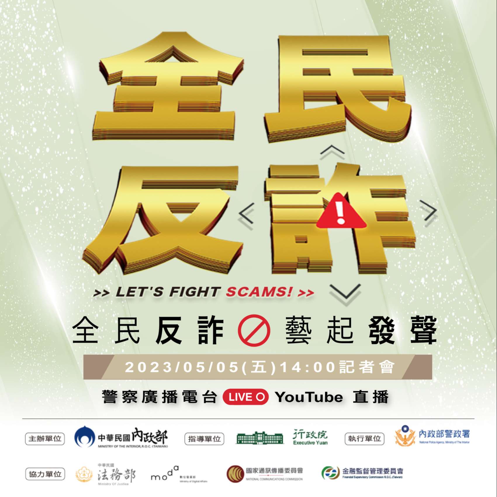 二、為使民眾對反詐議題產生共鳴,營造全民齊心反詐氛圍,內政部定於112年5月5日14時至16時舉行「全民防詐,藝起發聲」記者會及「全民反詐日」擴大宣導活動,俾利廣泛觸及全民知悉。