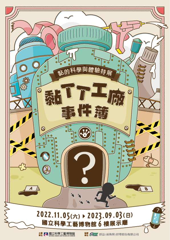 (三)展覽介紹:大小朋友將化身偵探,親身走入故事場景,來到工廠調查案件。依循偵查手冊引導,以掌握事件開端及關鍵人物,利用科學「黏」理,體驗黏、觸碰黏、踏上黏實驗黏,完成偵查解密任務。