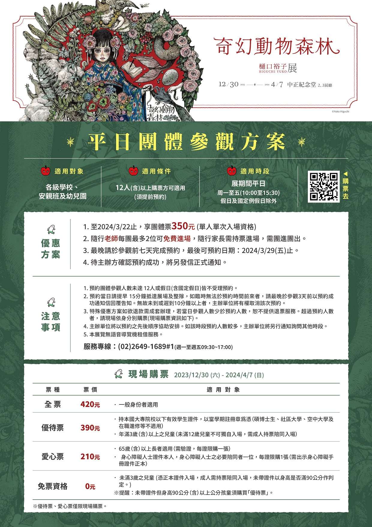 (一)不能不認識!日本新銳畫家、藝術家--樋口裕子(HIGUCHI YUKO),獨特風格吸引了許多知名品牌邀請合作,其中以2018年開始的GUCCI聯名系列受到國際關注。作品常以貓咪、鳥類、蘑菇等動植物作為主題,現實與幻想交錯而成的繪畫呈現,創作出樋口裕子獨有的世界觀。已巡迴日本十座城市的大型特展首次來台,並特別規劃森林主題的展場,精選千件以上作品,包含繪本創作、近年大量的海報設計、聯名合作等經典繪畫手稿,及與樋口裕子長年合作的布偶藝術家今井昌代所創作精緻生動的毛氈玩偶,另規劃台灣限定拍照場景,帶領台灣觀眾進入異世界奇幻森林。