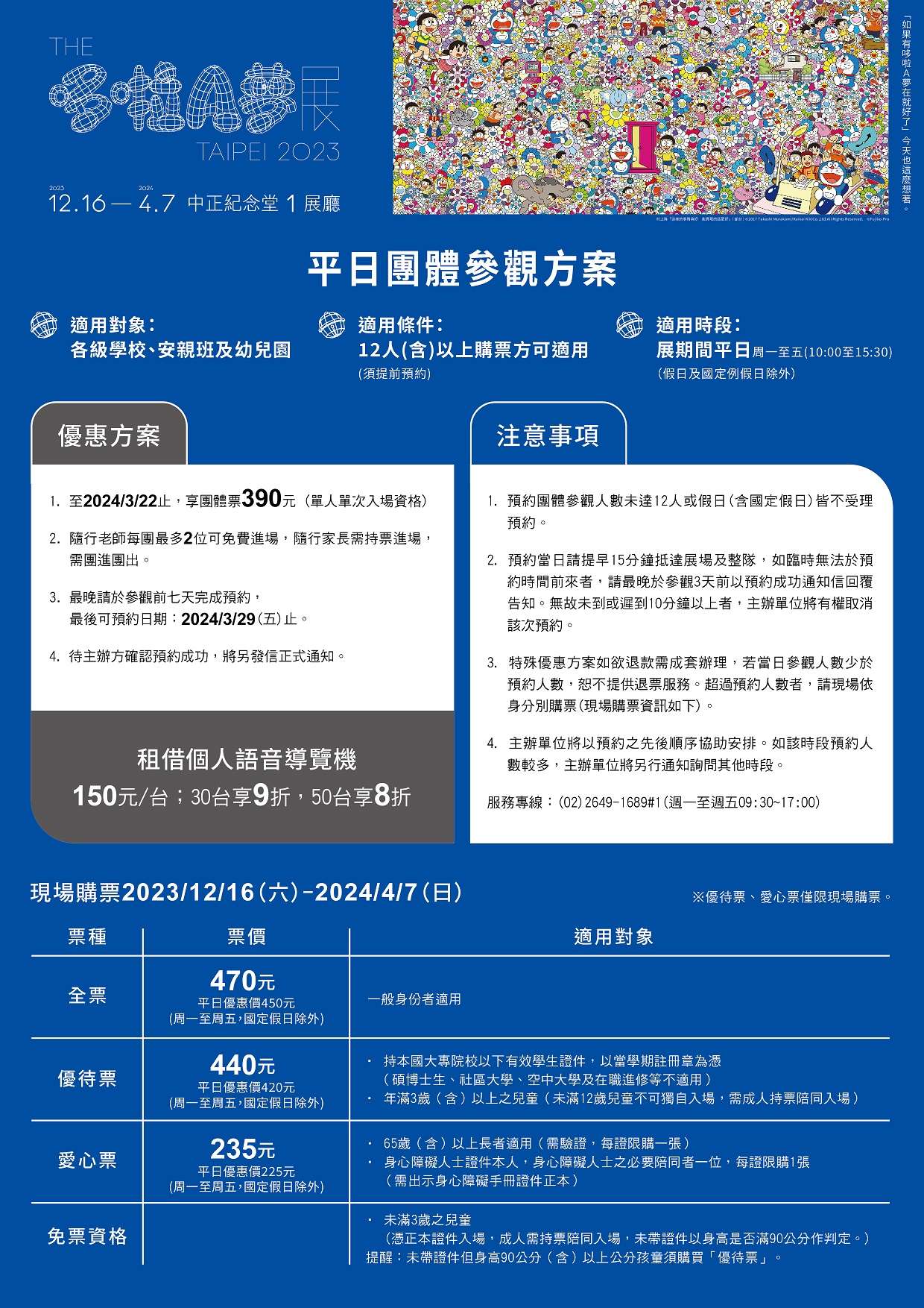 四、為利於學校團體觀展安排,本次兩檔節目皆在中正紀念堂展出,並規劃有平日團體參觀優惠方案,期待藉此更加豐富課程內容,促進學子們更多元學習。