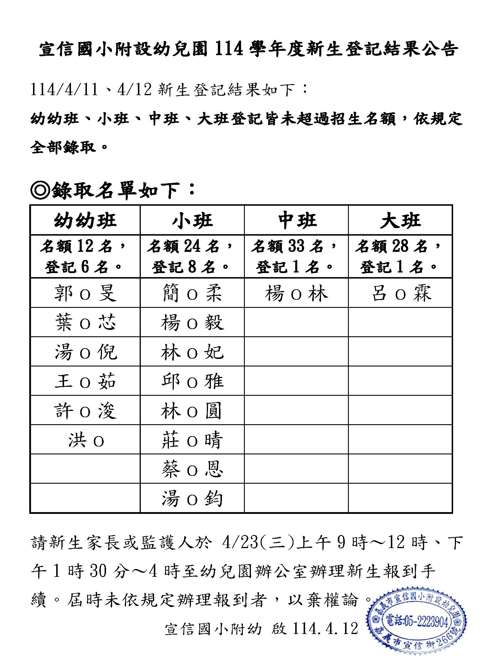 宣信國小附設幼兒園114學年度新生登記結果公告: