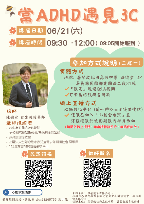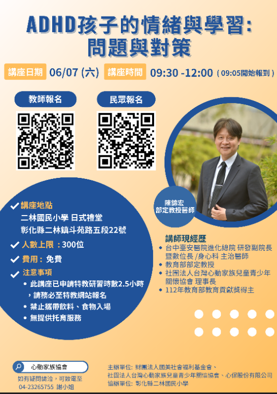 三、本次講座有申請全國特教時數2.5小時,若有需求請至全國 特教時數網報名。