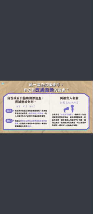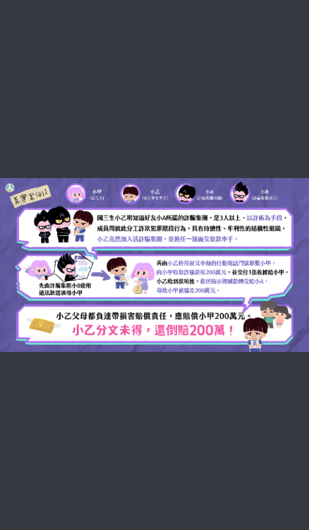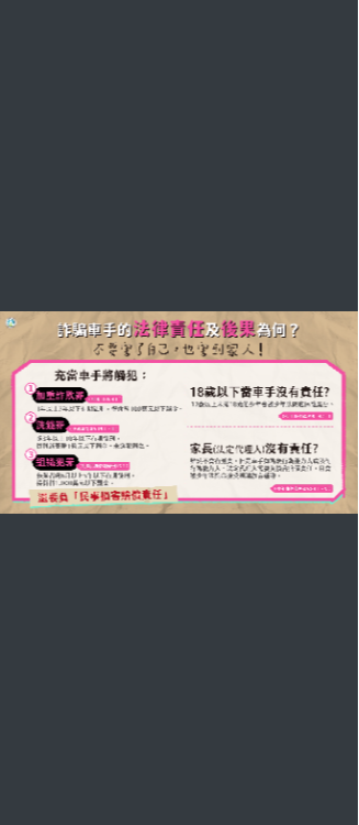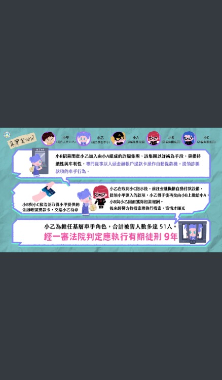 二、近年來學生擔任車手涉詐欺案件數攀升,尤以12至23歲涉 案最多,教育部藉由真實案例,解析學生擔任詐騙車手所 可能承擔的法律責任,製作本案懶人包,避免學生遭不法 分子利用,衍生後續的法律風險與責任。