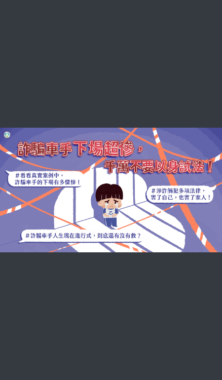 三、本案懶人包電子檔亦可於「教育部詐騙防制專區」下載運 用(https://reurl.cc/A3Wyye;路徑如下:宣導素材/各式 文宣/「詐騙車手下場超慘,千萬不要以身試法!」宣導懶 人包)