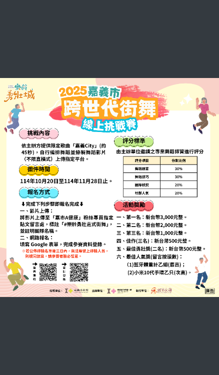 1、將影片上傳至「嘉市A健康」粉絲專頁指定貼文留言 處,標註「#樂齡勇壯嘉式街舞」,並標註團隊名稱 (網址:https://www.facebook.com/share/p /1CyyqcMxpo/)。