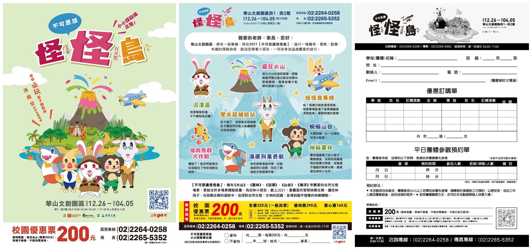 一、為培養年輕學子們在藝術設計領域無遠弗屆的想像力及發展台灣文創展覽,本展覽以親子互動體驗為藍圖,打造海、陸、空奇幻場景主題樂園,提供大朋友、小朋友們,搭上怪怪島專機,登島探險,怪怪島擁有《火山》、《叢林》、《沼澤》、《山谷》、《海洋》等豐富的自然生態場景,結合各展區場景,傳遞大自然的生態知識,搭配精心設計的冒險任務,讓大朋友、小朋友在挑戰任務的過程中,加深對自然生態、生物的認識,寓教於樂、增進親子關係。