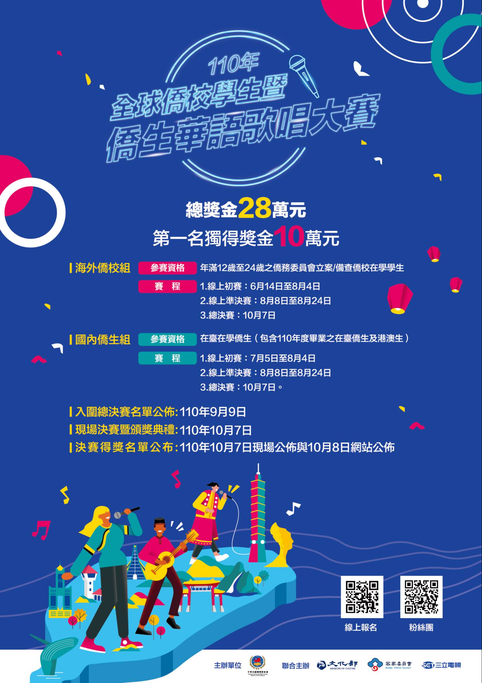 二、旨揭賽事係為鼓勵全球僑校學生及國內僑生藉由傳唱華語、閩南語及客語等歌曲,強化華語文學習動機、認識及體驗臺灣不同族群語言及流行音樂文化,先予敘明。