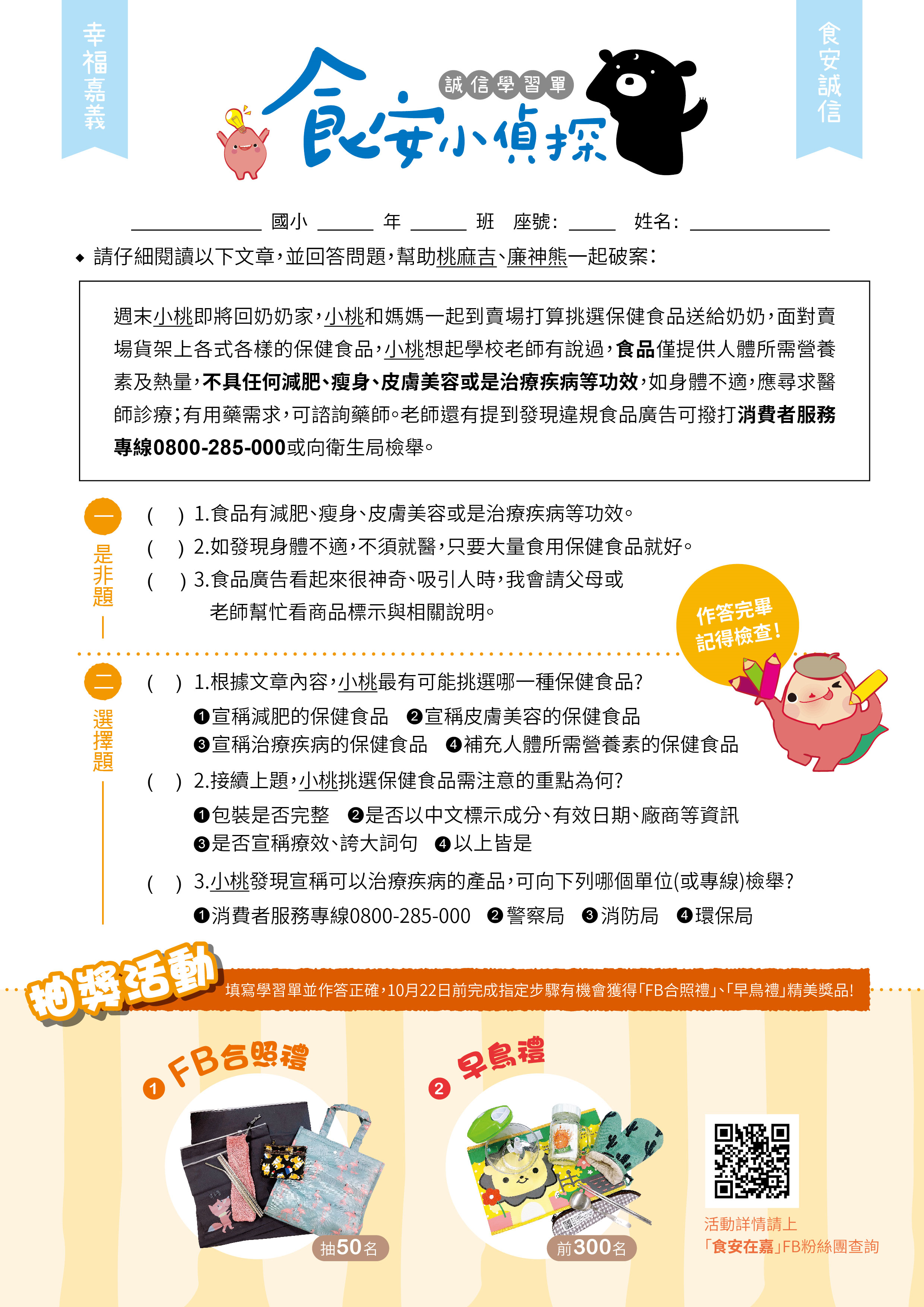 步驟4.將學習單投稿郵寄至嘉義市政府衛生局食品藥物管理科-食安誠信活動小組收(600嘉義市德明路1號),即符合早鳥禮資格。