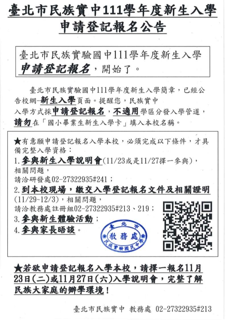 三、入學說明會辦理時間分別為110年11月23日(二)晚間7時至9時、110年11月27日(六)上午9時至11時,擇一場報名參加即可。報名截止日期為110年11月22日(一)晚間10時止。報名連結:https://forms.gle/xy8JhYemLAVLUd9H9。