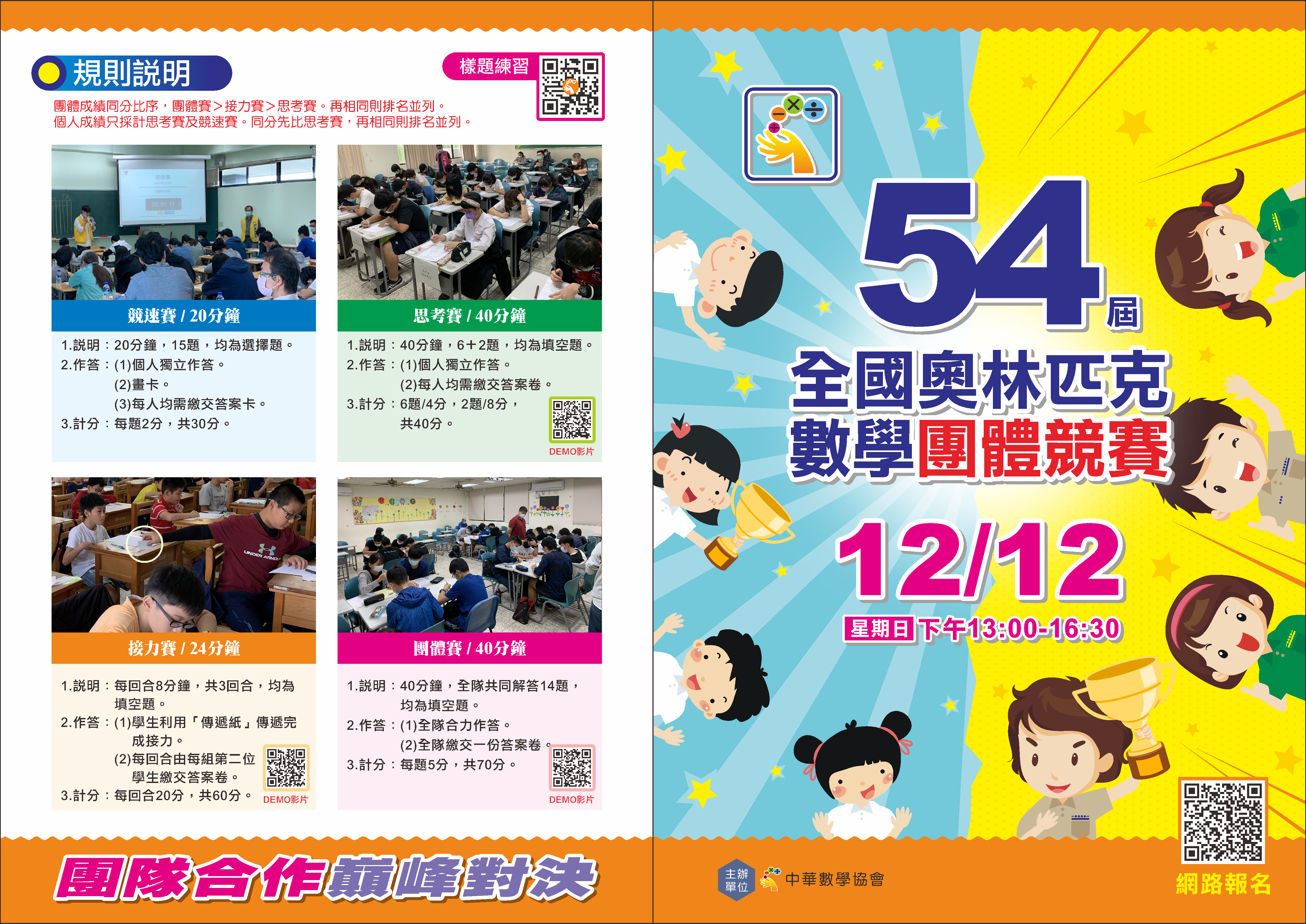 中華數學協會推廣國小、國中至高中之數理教育,謹訂於110年12月12日(日)舉辦 「第54屆全國奧林匹克數學團體競賽」,歡迎學生參加!