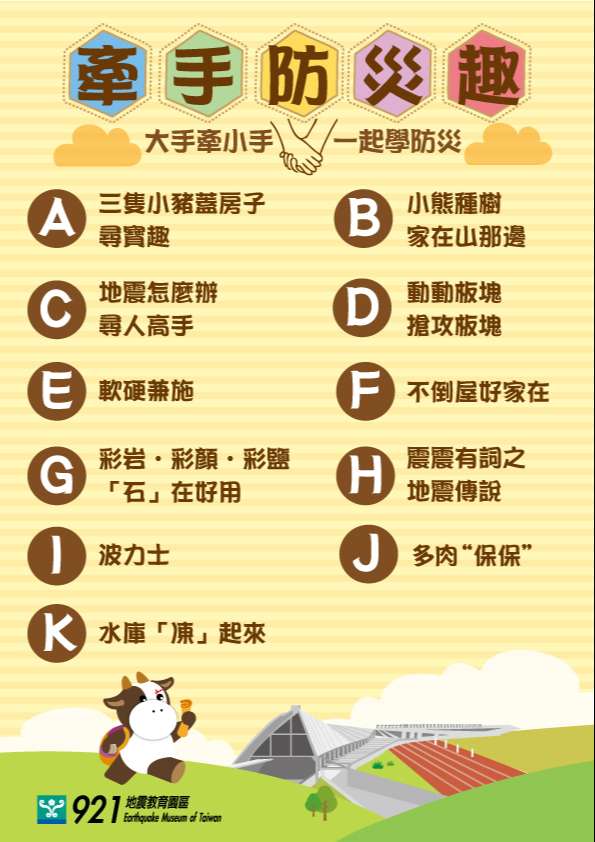 二、園區致力於推廣地震知識、建築安全與防災教育工作,於寒假期間特別規劃旨揭到校服務活動,透過套裝課程,帶領大家從多元主題來認識地震、水土保持與防災,檢送活動海報電子檔如附件。