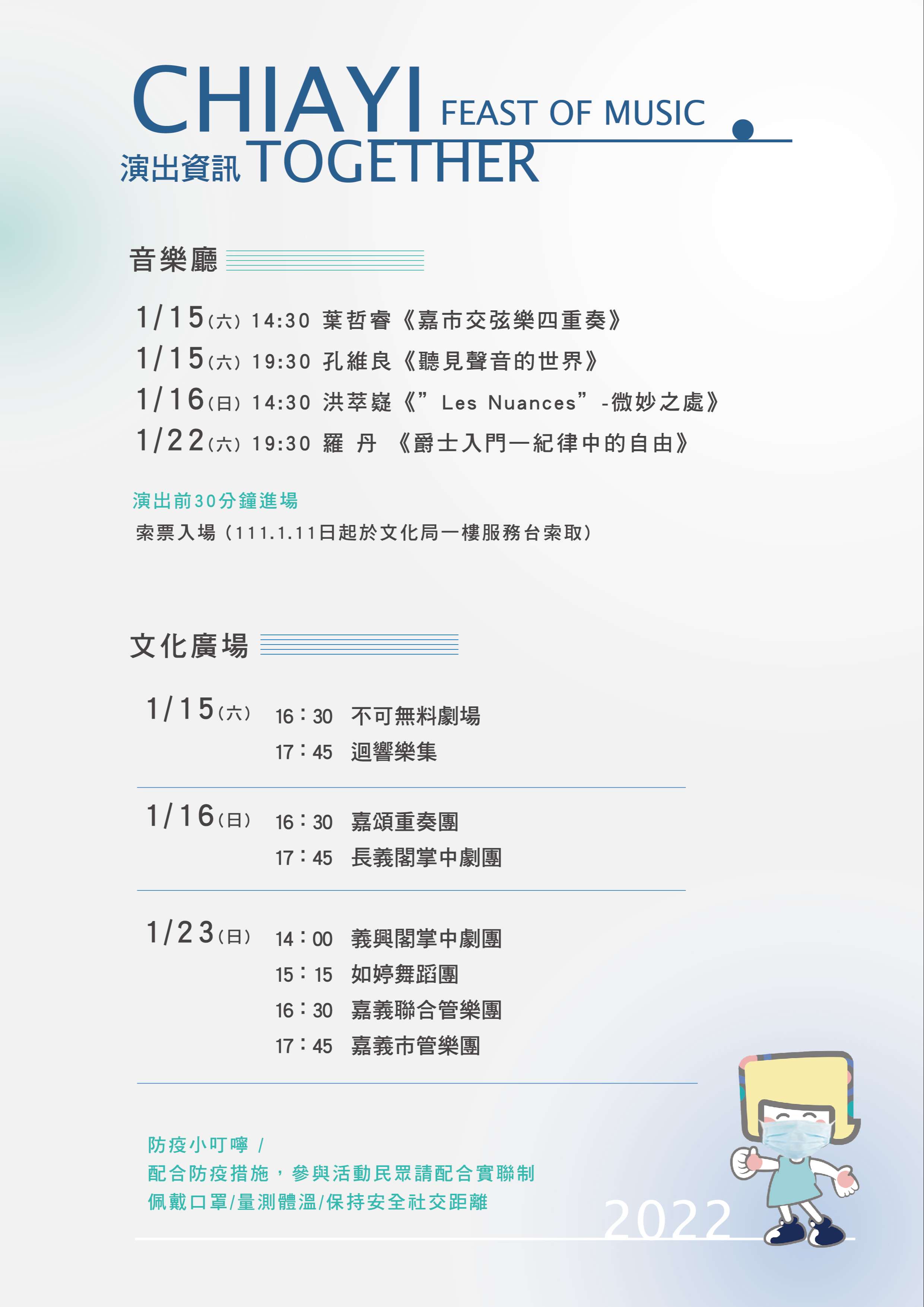 一、旨揭活動於111年1月15日至23日在嘉義市政府文化局音樂廳與文化廣場演出。 二、索票訊息:111年1月11日起於嘉義市政府文化局一樓服務台索取。