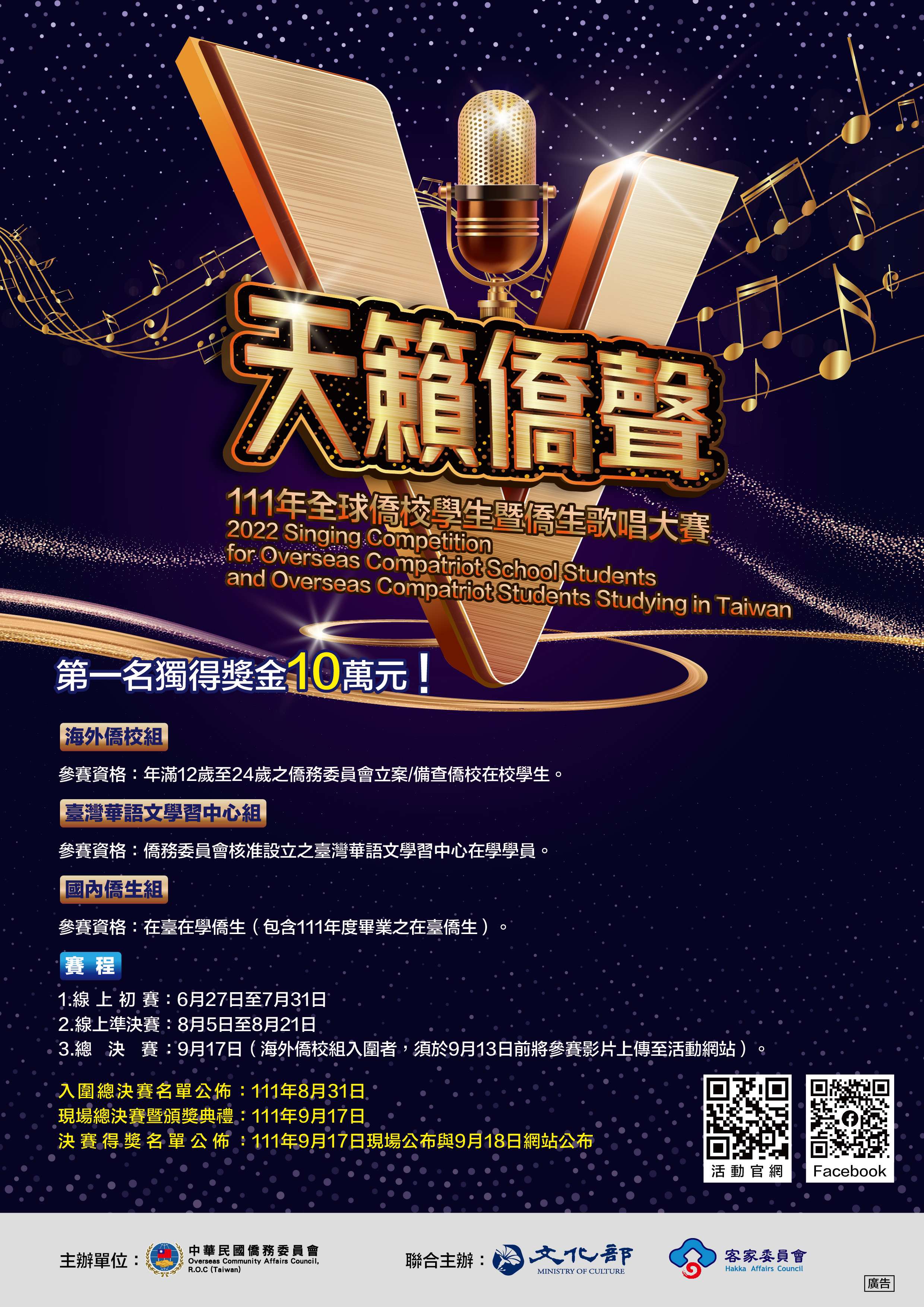 二、該會為鼓勵全球僑校學生、臺灣華語文學習中心及國內僑生藉由傳唱華語、閩南語及客語等歌曲,強化華語文學習動機、認識及體驗臺灣不同族群語言及流行音樂文化,爰規劃辦理旨揭賽事。