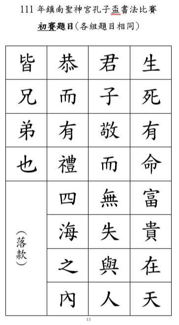 三、書法比賽需寄送初賽作品至「鎮南聖神宮」,初賽題目如附件。