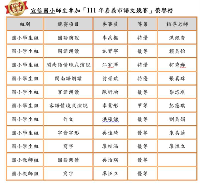 狂賀!宣信國小111學年度嘉義市語文競賽師生大放異彩!榮獲國小學生團體成績第五名!