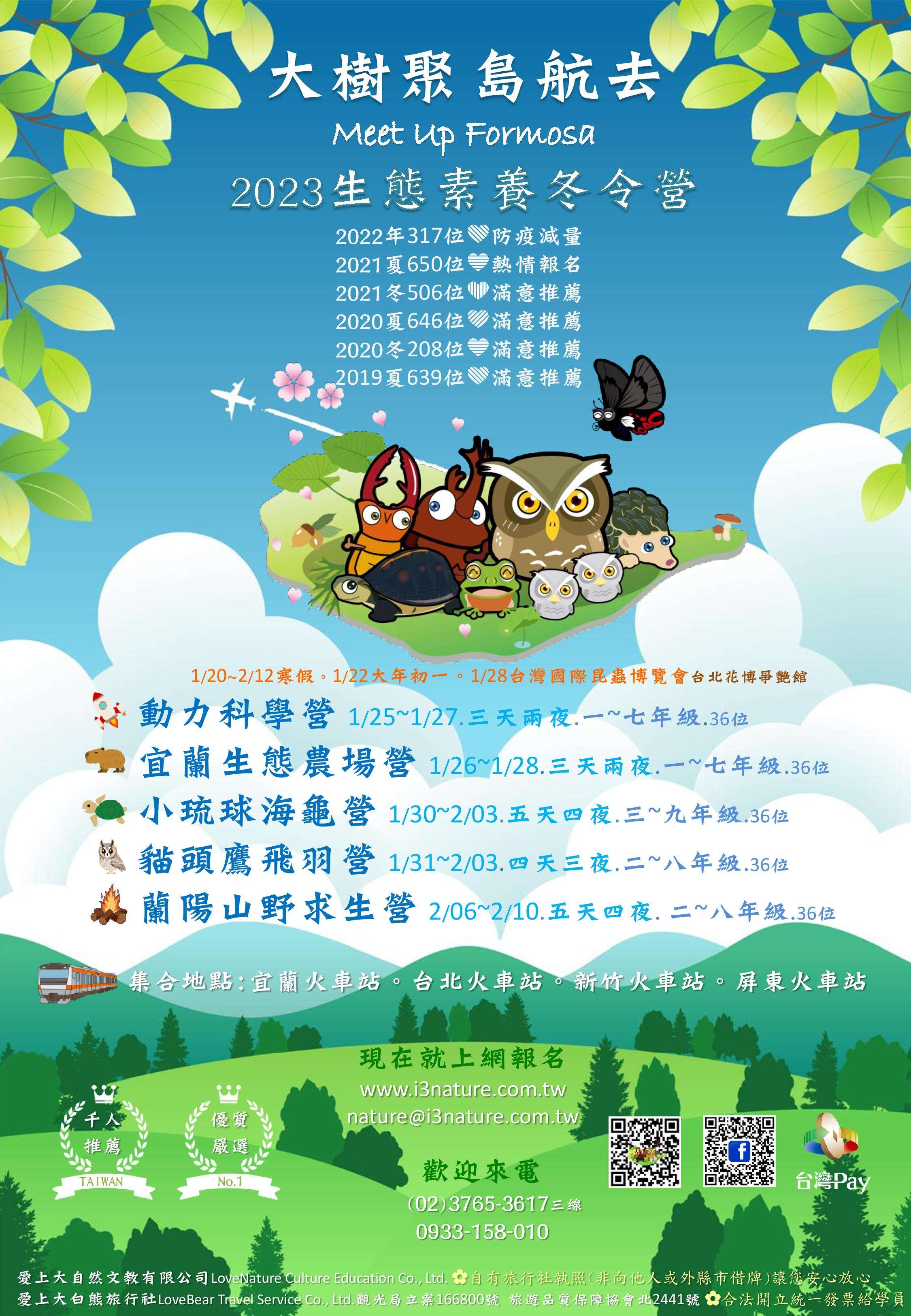 一、2023生態素養冬令營五種課程日期1/25~2/10,招生涵蓋1~9年級學生,詳請見網站www.i3nature.com.tw。