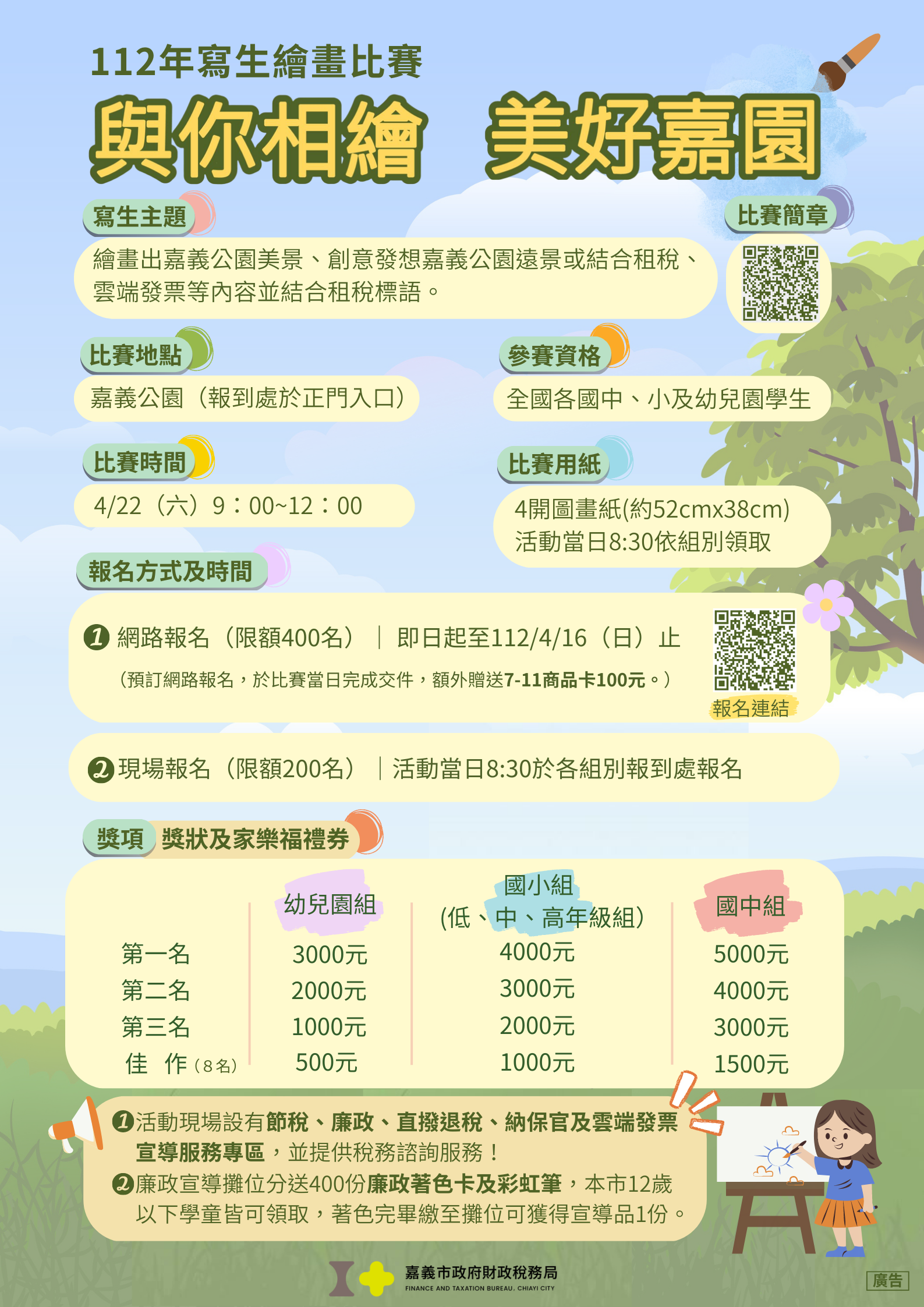 (一)繪畫嘉義公園美景、創意畫出嘉義公園未來願景或結合地方稅、雲端發票等相關租稅內容,需結合租稅標語(可參考簡章「十四、標語範例」或自行發想)。