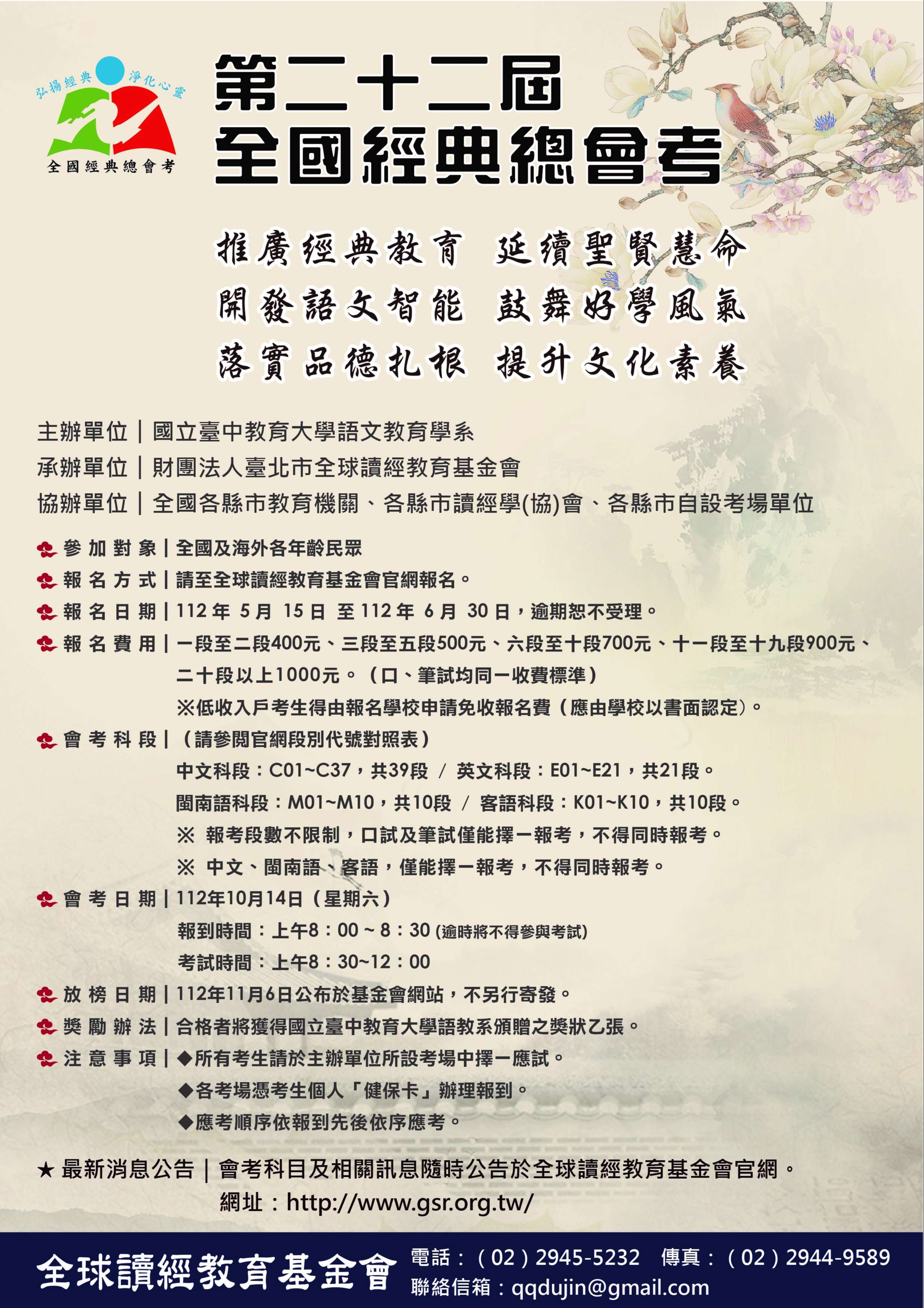 財團法人臺北市全球讀經教育基金會「第22屆全國經典總會考」5/15開始報名,歡迎學生踴躍參加。