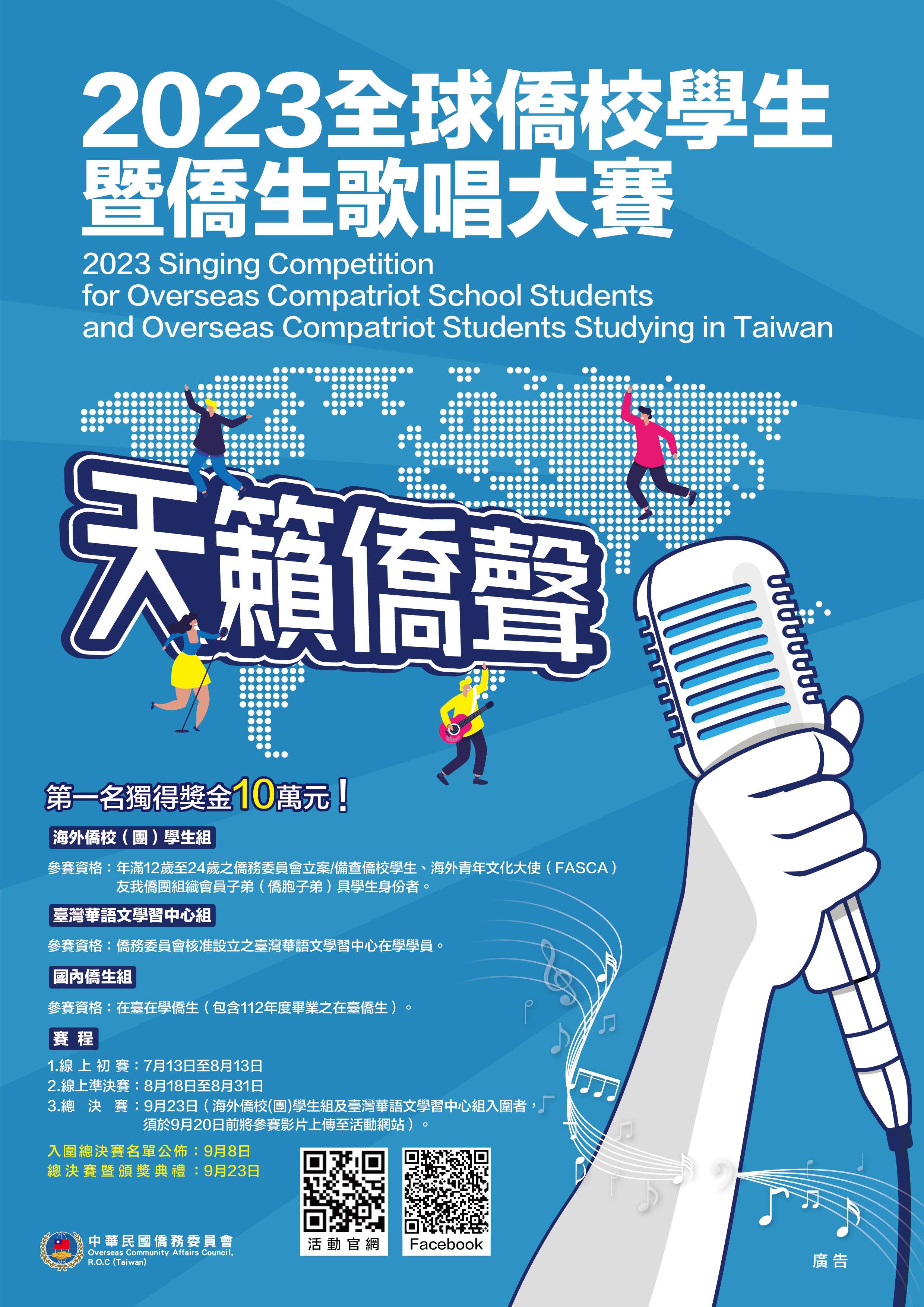 二、旨揭賽事係為鼓勵鼓勵全球僑校學生、僑胞子弟、臺灣華語文學習中心及國內僑生藉由傳唱華語、閩南語及客語等歌曲,強化華語文學習動機、認識及體驗臺灣不同族群語言及流行音樂文化,爰續規劃辦理旨揭賽事。