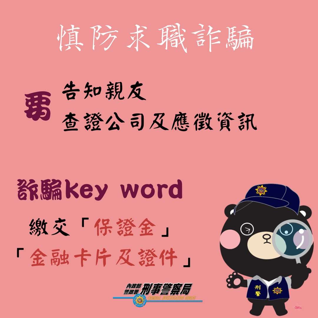 1.內政部 花敬群政務次長:求職打工「停、看、聽」,避免落入詐騙集團陷阱,勿因高薪淪為車手,後果得不償失。