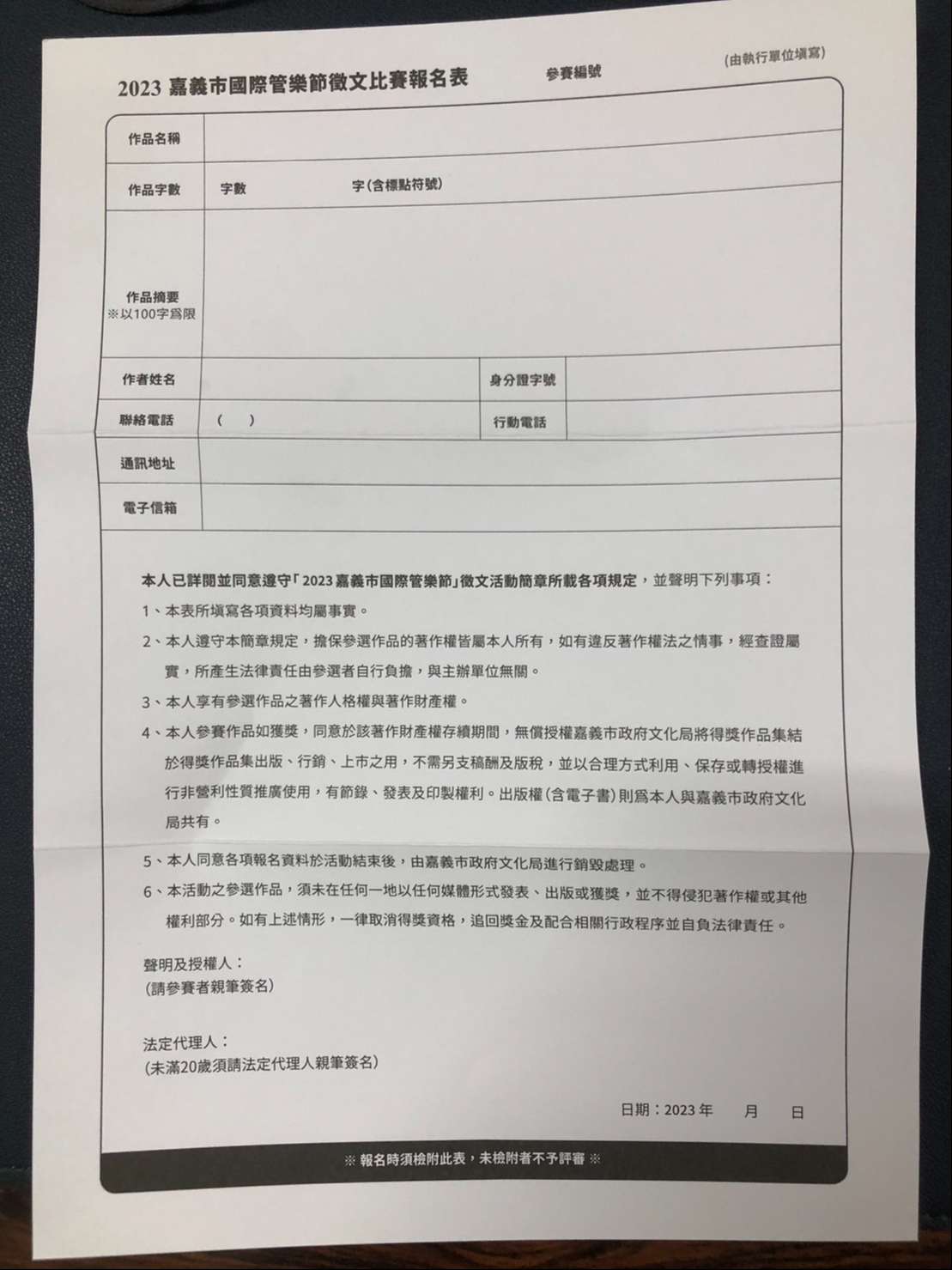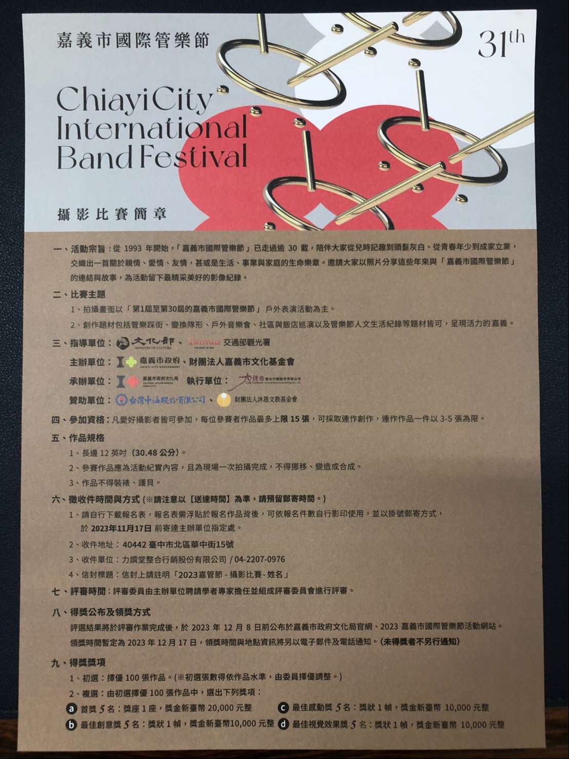 一、至1993年開始,「嘉義市國際管樂節」已辦理30載,陪伴大家從兒時記趣到頭髮灰白、從青春年少到成家立業,交織出一首關於親情、愛情、友情,甚或是生活、事業與家庭的生命樂章。邀請大家以照片及文字分享這些年來與「嘉義市國際管樂節」的連結與故事,為活動留下最精采美好的文字及影像紀錄。